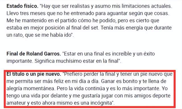 而根据赛后马卡报刊出的采访,纳达尔自己也亲口承认正在遭受非常严重的伤病折磨。他表示:“我宁愿输掉周日的决赛,来换上一只新的脚,从而能让我在日常生活中更快乐。赢球是美妙的,会让你充满瞬间的快乐。但生活还在继续,这是最重要的。我有自己的生活,我想和我的朋友们一起玩,但这现在是个谜团。”