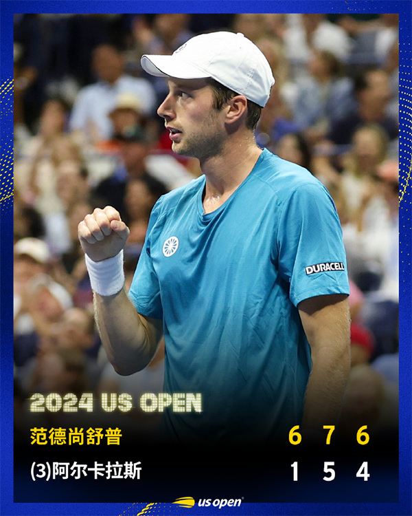 到了无路可退的第三盘,阿尔卡拉斯在第5局再次被破发,尽管他在第6局完成回破将比分追至3平,但在第9局,他又一次被破发。最终,范德尚舒普在第10局以“LOVEGAME”的完美表现拿下自己的发球胜赛局,阿尔卡拉斯以4-6输掉第三盘,遗憾地以0-3爆冷出局。