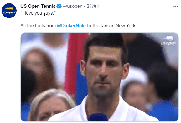 赛后德约科维奇强忍泪水,抽泣哽咽仍旧表达对球迷的喜爱,一句“我爱你们”瞬间点燃现场。