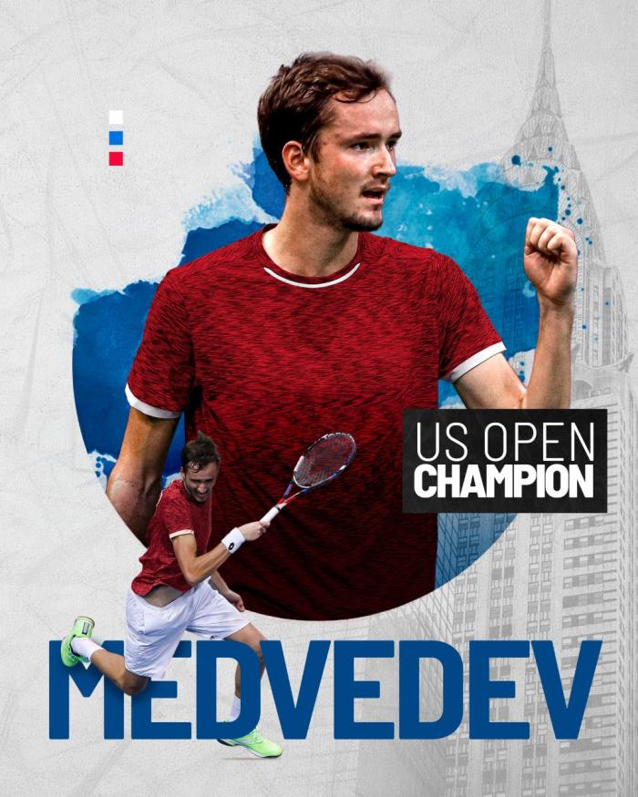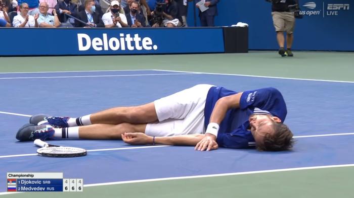 梅德韦杰夫连赢三盘,每一盘的比分都是6-4,总分3-0战胜网坛传奇德约科维奇夺得美网冠军,夺冠后梅德韦杰夫轰然倒下,倒在地上、张嘴吐舌疯狂庆祝,之后美网新王站起来,和德约科维奇拥抱致意。