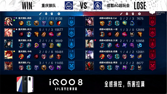 2分30秒,重庆狼队控下暴君。3分31秒,成都AG马可波罗下路击杀大乔拿下一血。5分34秒,重庆狼队上路打出0换2并破掉成都AG上一塔,镜拿下双杀。6分24秒,重庆狼队镜下路击杀娜可露露。6分41秒,重庆狼队破掉成都AG中一塔。7分05秒,重庆狼队控下暴君。8分22秒,双方团战3换3。8分57秒,成都AG破掉重庆狼队上一塔。10分12秒,双方2换2。10分52秒,重庆狼队控下暗影暴君。13分07秒,双方团,重庆狼队打出0换2。13分31秒,重庆狼队破掉成都AG中二塔。13分44秒,重庆狼队破掉成都AG上高地。14分10秒,重庆狼队赢下高地团,一波摧毁成都AG水晶拿下最终胜利!