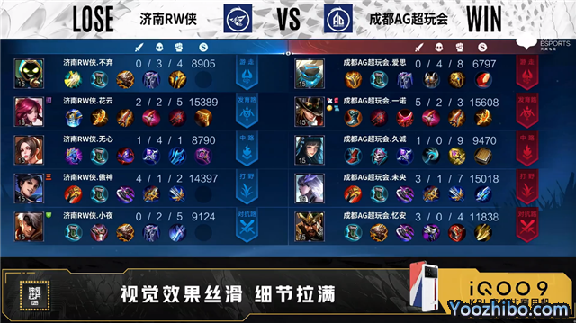 双方常规开局。46秒济南RW侠发育路击杀马可波罗拿到一血。2分24秒成都AG中路击杀不知火舞。2分46秒成都AG拿下暴君。3分43秒济南RW侠拿下主宰。5分36秒成都AG摧毁敌方中路外塔。5分47秒济南RW侠摧毁敌方发育路外塔。8分53秒成都AG摧毁敌方对抗路外塔。7分17秒济南RW侠拿下暴君。9分10秒野区团战济南RW侠击杀盾山。9分58秒中路团战济南RW侠打出1换3,曜拿到三连决胜。12分24秒野区团战成都AG打出1换3。14分43秒野区团战成都AG打出0换2。15分24秒成都AG拿下暗影暴君。16分10秒成都AG摧毁敌方中路二塔。17分09秒济南RW侠对抗路击杀盾山。18分07秒对抗路团战成都AG打出0换5。18分55秒成都AG摧毁敌方水晶拿下比赛。