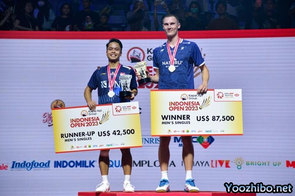 24直播网讯北京时间06月18日,在雅加达举行的2023年印度尼西亚羽毛球公开赛男单决赛中,丹麦选手安赛龙以2比0战胜印度尼西亚选手金廷,夺得冠军。