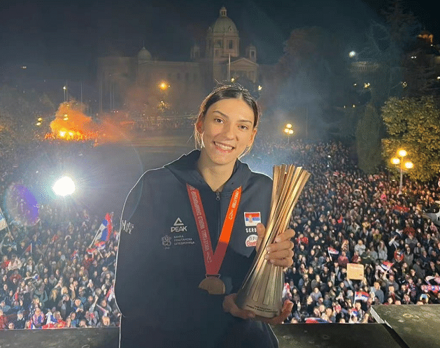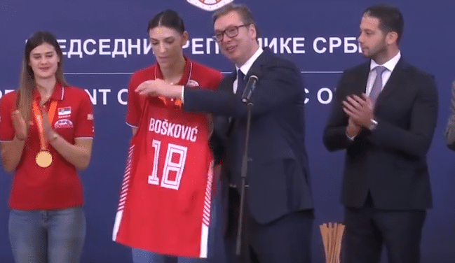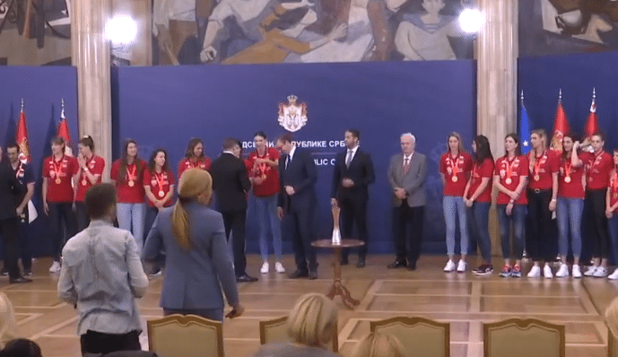 塞尔维亚总统也在现场发表讲话,恭喜球队拿下世锦赛冠军,全胜战绩实现卫冕。