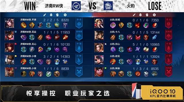 开局火豹三人抢线。56秒火豹发育路击杀鲁班大师拿到一血。3分02秒火豹主宰处击杀夏侯惇。4分13秒野区团战济南RW侠打出1换2。4分41秒济南RW侠摧毁敌方中路外塔。5分22秒济南RW侠野区打出0换2。7分22秒济南RW侠野区击杀吕布。7分53秒济南RW侠摧毁敌方中路二塔。9分30秒济南RW侠对抗路击杀盾山。10分01秒济南RW侠野区打出2换3。10分56秒济南RW侠拿下暗影主宰。11分29秒济南RW侠拿下暗影暴君。12分27秒高地团战济南RW侠打出0换4。12分44秒济南RW侠摧毁敌方水晶拿下比赛。