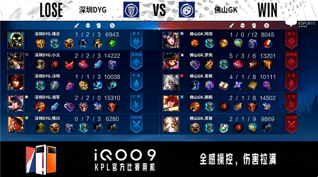 开局佛山GK边路换线。53秒佛山GK对抗路李元芳单杀吕布拿到一血。1分06秒佛山GK野区击杀太乙真人并反掉红BUFF。2分24秒对抗路双方1换1。3分36秒深圳DYG拿下主宰,团战佛山GK击杀吕布。6分16秒佛山GK对抗路击杀娜可露露。6分35秒中路团战佛山GK打出0换2。7分44秒主宰处团战深圳DYG打出0换2。9分02秒佛山GK拿下主宰。10分19秒佛山GK拿下暗影主宰。10分50秒佛山GK摧毁敌方对抗路二塔。11分11秒深圳DYG摧毁敌方中路外塔。12分15秒佛山GK摧毁敌方对抗路高地塔。12分24秒佛山GK发育路打出0换2。13分16秒深圳DYG野区击杀李元芳。14分22秒佛山GK拿下暗影主宰。15分06秒高地团战深圳DYG打出1换2。18分15秒主宰处团战佛山GK打出0换3。18分36秒佛山GK摧毁敌方水晶拿下比赛。