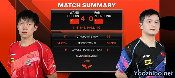第四局,樊振东状态有所提升,开局比分也是处于领先,不过王楚钦乘胜追击,中局阶段以7-6反超了比分。11-7王楚钦又强势拿下了第四局,从而以4-0战胜樊振东成功实现卫冕。