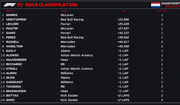 24直播网讯 2024F1荷兰大奖赛,迈凯伦车手诺里斯统治夺冠,领先优势达到22秒!红牛车手维斯塔潘生涯200场收获亚军,法拉利车手勒克尔季军。