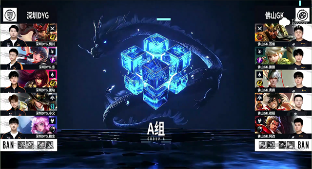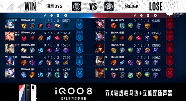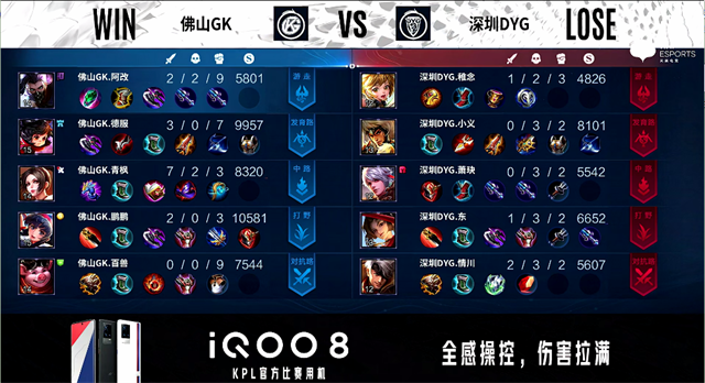 1分40秒,野区团,双方2换2。2分钟,佛山GK破掉深圳DYG下一塔。4分58秒, 佛山GK拿下先知主宰。6分27秒,佛山GK控下暴君。7分22秒,佛山GK兰陵王换掉成吉思汗,随后队伍破掉深圳DYG上二塔。7分48秒,佛山GK再次打出0换2并破掉深圳DYG上高地。8分20秒,佛山GK中路打出0换4并破掉深圳DYG中一塔。9分28秒,佛山GK控下先知主宰。10分09秒,佛山GK控下暗影暴君。10分37秒,佛山GK破掉深圳DYG下二塔。11分28秒,佛山GK控下暗影主宰,随后破掉深圳DYG中二塔。12分26秒,佛山GK先后破掉深圳DYG下、中高地,随后团战佛山GK打出1换3。12分37秒,佛山GK一波摧毁深圳DYG水晶赢下比赛。