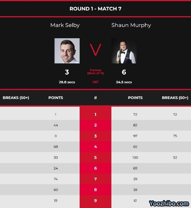 第一局,墨菲率先进入状态单杆72分、72-1先下一城。第二局,塞尔比继续低迷,墨菲则是多次上手82-44再胜一局,大比分2-0领先。第三局,墨菲趁热打铁,单杆75分、97-0零封又胜一局 ,3-0扩大优势。第四局,场面一度比较胶着,塞尔比艰难68-65扳回一局,上半场,墨菲3-1领先。