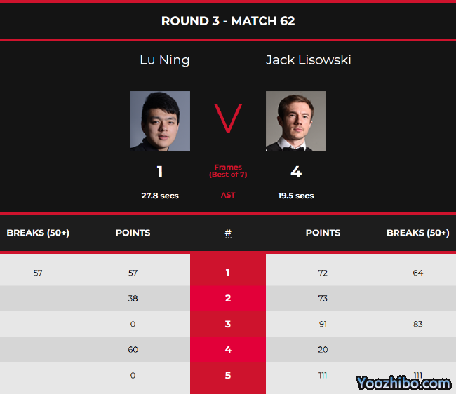 24直播网讯 北京时间9月29日凌晨,2022斯诺克英国公开赛正赛第3比赛日战罢。鲁宁的对手是赛会9号种子杰克-利索夫斯基。整场比赛,鲁宁发挥平平,只在首局打出单杆57分,相反,英格兰人则是打出了1杆破百和2杆60+,最终,利索夫斯基以72(64)-57(57)、73-38、91(83)-0、20-60和111(111)-0,大比分4-1获胜,闯入16强。