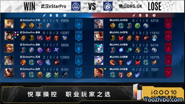 开局双方正常抢线。1分53秒发育路武汉eStarPro击杀公孙离,拿下一血。2分07秒武汉eStarPro拿下主宰,佛山DRG.GK拿下暴君。2分28秒对抗路武汉eStarPro击杀嬴政,打出0换1。3分26秒发育路武汉eStarPro击杀刘邦,打出0换1。4分39秒对抗路武汉eStarPro击杀刘邦,摧毁敌方发育路外塔、对抗路外塔。6分04秒中路武汉eStarPro击杀嬴政,佛山DRG.GK摧毁敌方对抗路外塔,武汉eStarPro拿下暴君。6分53秒河道武汉eStarPro击杀夏侯惇,摧毁敌方中路外塔。7分58秒武汉eStarPro摧毁敌方发育路二塔,曜二连击破,打出1换4,摧毁敌方发育路高地,摧毁水晶拿下比赛。
