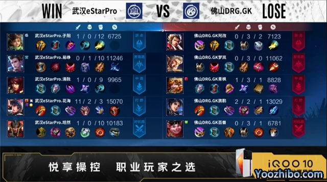 开局双方正常抢线。2分05秒武汉eStarPro拿下暴君。2分59秒野区武汉eStarPro击杀马可波罗,拿下一血。5分01秒野区佛山DRG.GK击杀东皇太一,摧毁敌方对抗路外塔,拿下主宰。5分59秒野区佛山DRG.GK击杀东皇太一,双方打出1换1。7分57秒武汉eStarPro摧毁敌方发育路外塔。7分48秒野区武汉eStarPro击杀铠,摧毁敌方发育路二塔,拿下暴君,佛山DRG.GK摧毁敌方对抗路外塔。9分28秒武汉eStarPro摧毁敌方中路外塔,10分17秒拿下暗影主宰。11分06秒武汉eStarPro拿下暗影暴君。12分03秒高地佛山DRG.GK击杀不知火舞,武汉eStarPro摧毁敌方发育路高地,佛山DRG.GK摧毁敌方中路外塔。13分14秒野区武汉eStarPro击杀马可波罗,摧毁敌方中路二塔、高地。14分11秒武汉eStarPro拿下暗影主宰。14分56秒武汉eStarPro拿下暗影暴君,高地击杀铠,打出0换3,摧毁水晶拿下比赛。