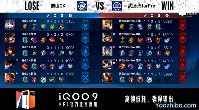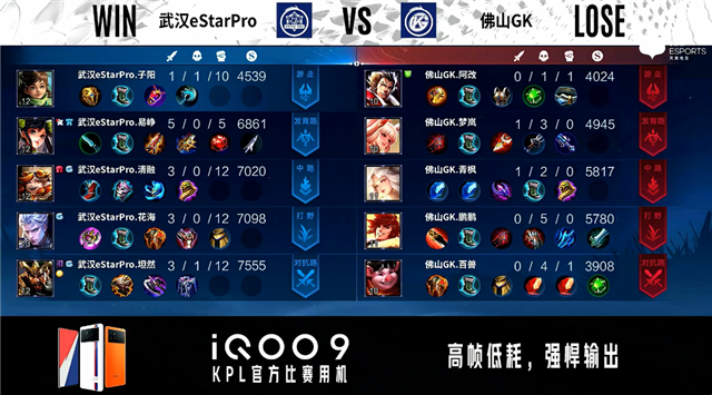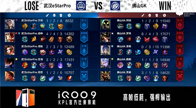 双方常规开局。1分24秒武汉eStar中路击杀裴擒虎拿到一血。2分09秒武汉eStar对抗路击杀裴擒虎。3分02秒武汉eStar野区打出0换3。3分46秒佛山GK暴君处击杀桑启。4分14秒佛山GK摧毁敌方发育路外塔。5分11秒武汉eStar野区打出0换2。5分35秒武汉eStar摧毁敌方中路外塔。5分59秒武汉eStar对抗路打出0换2。7分36秒武汉eStar拿下主宰。6分10秒武汉eStar摧毁敌方对抗路二塔。9分58秒武汉eStar团灭对手摧毁水晶拿下比赛。