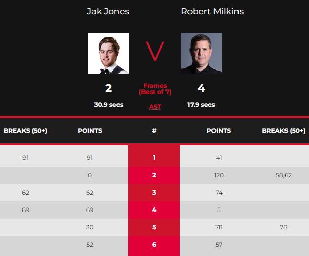 在米尔金斯和杰克·琼斯的比赛之中,两个人都打出了非常不错的表现。在首局比赛中,米尔金斯拿到41分出现失误,琼斯单杆轰出91分以91:41拿下此局取得1-0的领先。第二局,米尔金斯单杆轰出58分和62分以120:0拿下此局1-1战平琼斯。第三局,虽然琼斯单杆打出62分,但是米尔金斯依然以74:62拿下此局取得2-1的领先。