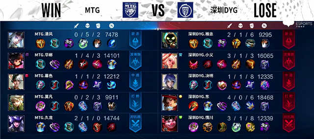 开局MTG入侵蓝区拿下蓝Buff。2分40秒MTG再次入侵野区,娜可露露拿下一血。3分钟娜可露露拿下主宰。4分40秒裴擒虎拿下暴君。5分40秒深圳DYG强攻下路一塔,伽罗被击杀,老夫子推掉上路一塔。6分钟中路团战,大乔被击杀。6分20秒野区团战,双方2换2。7分40秒下路团战,MTG打出0换2。7分50秒双方互换边路二塔。8分钟中路团战,双方1换1。9分37秒裴擒虎拿下暴君。10分29秒娜可露露拿下暴君,裴擒虎拿下主宰。14分20秒中路团战,双方1换1,深圳DYG推掉中路一塔。15分钟暴君团,深圳DYG打出1换2。15分20秒娜可露露拿下暴君。16分18秒娜可露露拿下主宰。17分钟周瑜推掉中路一塔。19分30秒上路团战,深圳DYG打出1换4。20分12秒深圳DYG推掉水晶再拿一分。