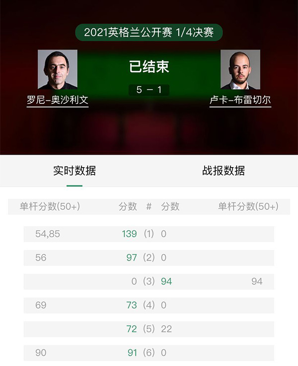 英格兰公开赛1/4决赛,奥沙利文5-1绅士横扫布雷切尔晋级4强。比赛伊始奥沙利文便火力全开,仅用时8分钟便完成连续两杆50+,单局139-0布雷切尔气吞山河。而布雷切尔显然对于火箭开场操作打懵,第二局再次防守不到位,奥沙利文再添单杆56分2-0领先。前两局轻松获胜的火箭稍有放松,第三局小角度拼中袋不中漏下绝佳机会,平静呼吸的布雷切尔轰出单杆94分还以颜色。随后布雷切尔又一次第一杆便漏球,火箭一杆致命3-1进入中场休息。下半场布雷切尔一杆超级大翻袋上手,但随后再次失误送机会,奥沙利文围球33分后贴库红球不中留下袋口,面对大好球形“比利时子弹”再次薄球失误,奥沙利文接管一杆制胜拿到赛点。大比分落后的布雷切尔没了心气,奥沙利文乘胜追击5-1大胜布雷切尔。