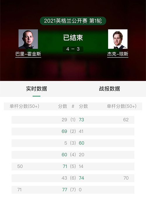 北京时间2021年11月2日刚刚结束的世界斯诺克英格兰公开赛第一轮比赛中,霍金斯单杆50分和71分的表现以4-3绝杀单杆打出62分和70分的杰克·琼斯。在霍金斯和杰克·琼斯的比赛中,两个人的表现都很一般,所以比赛一度非常胶着。