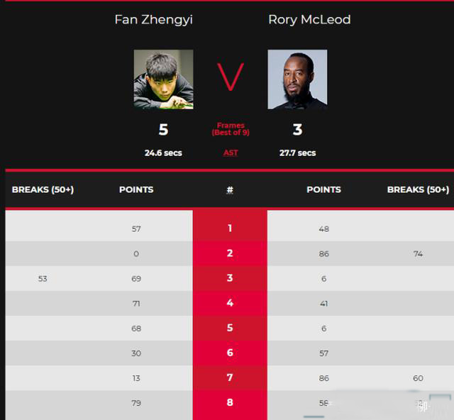第五局,局间休息回来之后,范争一以68-6胜出,比分优势扩大到4-1,轻松赢得三个赛点。第六局,没有退路的麦克劳德顽强反击,57-30挽救第一个赛点,比分来到2-4。第七局麦克劳德单杆60分制胜,86-13挽救第二个赛点,比分追成3-4。第八局,麦克劳德又打出单杆52分,范争一则通过几次上手,79-58锁定胜局,总比分5-3战胜对手晋级正赛。