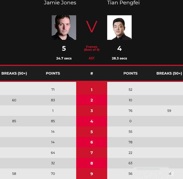 第一局,田鹏飞错失机会,出现了几次的失误,被琼斯惊险拿下,第二局,琼斯又打出单杆60分再下一城,第三局,田鹏飞单杆59分还以颜色,扳回一局,而第四局,田鹏飞一次漏球被琼斯单杆85分一杆制胜,上半场,琼斯3-1领先。中场休息过后,田鹏飞零敲碎打,虽然都没有打出单杆高分,但还是顺利连赢两局,将大比分3-3扳平。