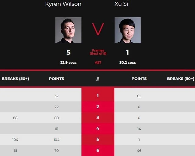 ,斯诺克职业联赛继续进行,斯诺克德国大师赛即将迎来资格赛的较量,与凯伦威尔逊的较量,徐思拥有一个很完美的开局,82-32,拿下第一局胜利!不过此后,凯伦威尔逊发力,徐思连输5局,1-5告负。整场比赛,凯伦威尔逊轰出了1杆破百(第五局单杆104分),3杆60+,徐思则是没有单杆50+表现,第二局和第三局全部都是被零封。