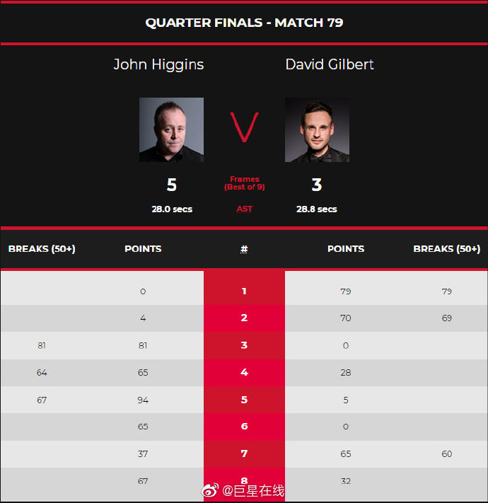 前两局希金斯完全被压制,几乎没有什么得分机会,合计才拿到4分,吉尔伯特则是连续单杆79分和单杆69分连赢两局,取得了2-0的领先。第三局,希金斯及时止住了颓势,单杆81分一杆制胜、零封了土豆哥,大比分追到1-2。第四局,希金斯又打出了单杆64分、65-28再追一局,2-2进入到中场休息。