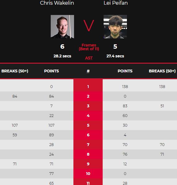首局雷佩凡单杆138分拿下,第二局韦克林单杆84分拿下;随后雷佩凡连胜两局。韦克林强势反击,单杆107追回一局,随后单杆59分以89-4再下一局。双方3-3。