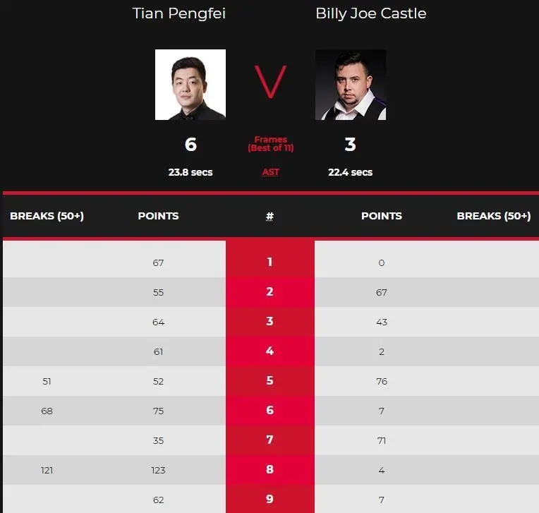 第8局,田鹏飞打出本场比赛的最佳单杆表现,他的单杆121分制胜,123-4轻松胜出,比分优势扩大到5-3,并赢得2个赛点。第9局,田鹏飞没有给卡斯尔挽救赛点的机会,他以62-7锁定胜局,总比分6-3轻松战胜对手晋级第三轮。