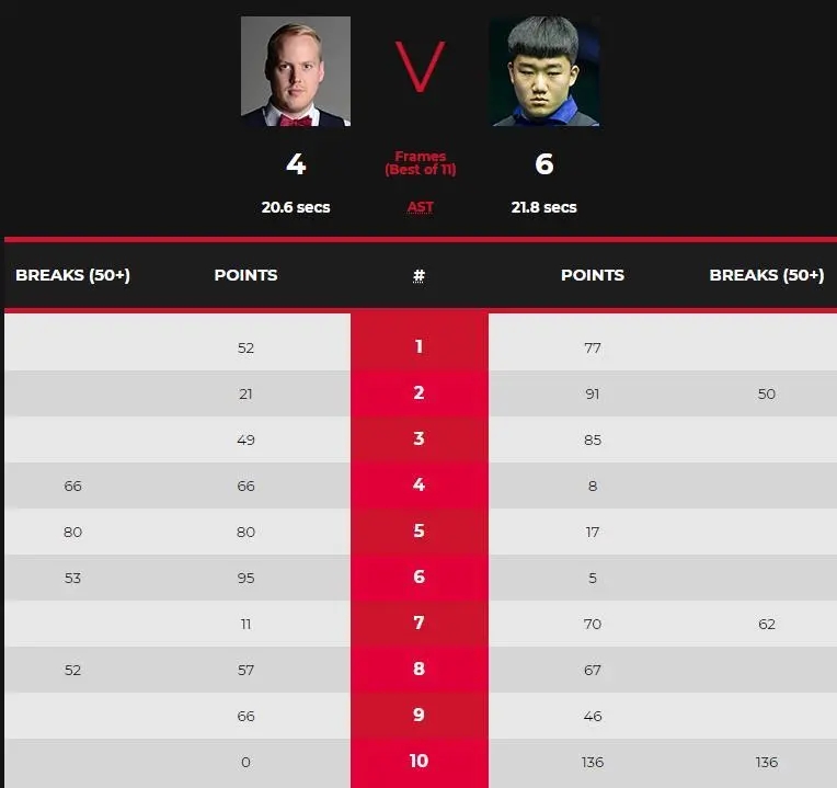 第10局,白朗宁再也没有给对手泰勒机会,他轰出单杆136分,这也是本场比赛唯一一杆破百,136-0零封泰勒,总比分6-4晋级第二轮。