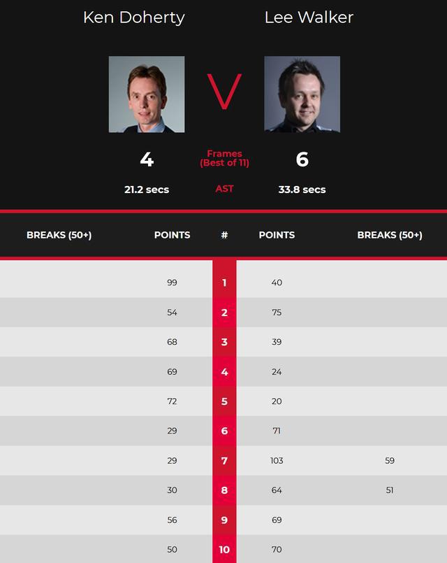 在上半场,两人连续得分能力都不强,均未能打出单杆50+,不过李沃克更加糟糕。达赫迪第1局便99-40拿下,在第2局,李沃克及时调整,75-54还以颜色,大分1-1扳平。第3局和第4局,达赫迪发力,68-39和69-24连赢两局后,达赫迪3-1领先,进入到中场休息时间。