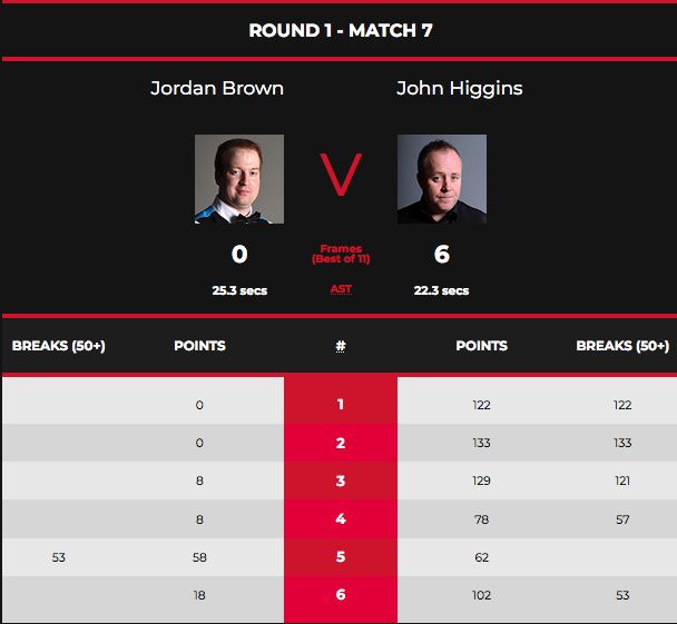 第4局单杆57分,第5局乔丹布朗单杆53分本有机会扳回一局,奈何出现失误,希金斯以62比53拿到赛点,第6局乔丹布朗仍有机会上手,但再次出现失误,希金斯两度上手凭借单杆53分以6比0横扫乔丹布朗强势晋级。