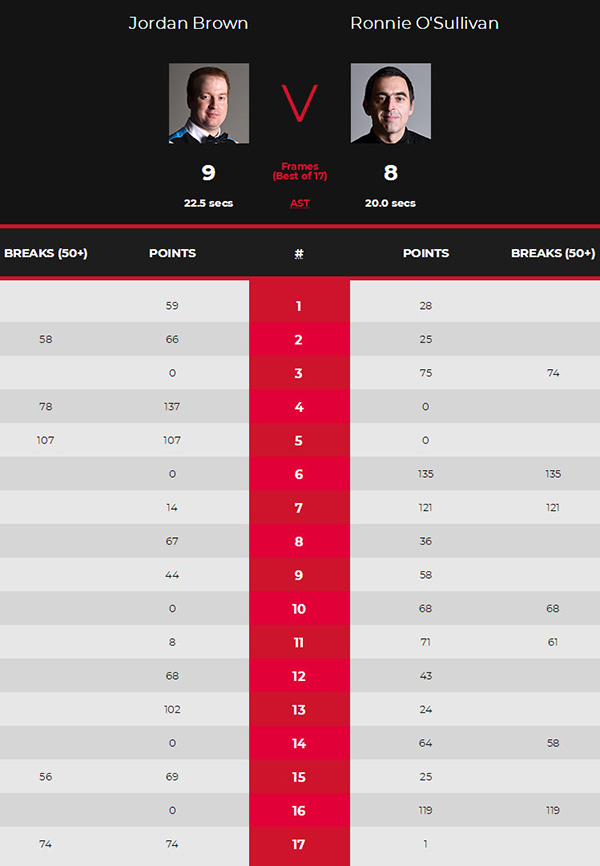 第15局比赛中,布朗率先上手围球,连得13分后架杆进攻绿球出现失误,此后奥沙利文也没能抓住机会,连得25分后再次出现失误。布朗顶住压力连得56分超分胜出,总分8-7率先来到赛点。第16局奥沙利文轰出个人本场第三杆破百,挽救赛点总分来到8-8平。决胜局中,奥沙利文打进一杆幸运球后,拼顶袋长台蓝球不进,布朗随后围球打出单杆74分一杆制胜,总分9-8完胜绝杀,生涯首夺排名赛冠军。