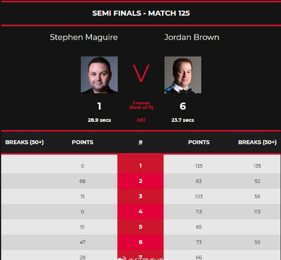 第六局,布朗单杆59分以73:47拿下此局比赛胜利以5-1领先马奎尔率先拿到赛点。