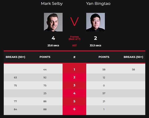 第五局,颜丙涛单杆21分,进攻蓝球K球,结果撞进了红球;防守比拼,颜丙涛摔袋,塞尔比单杆77分拿下。第六局,颜丙涛摔袋,塞尔比进攻不进留下机会,颜丙涛打进红球,颜丙涛K散红球堆,没有机会不说,还成为了防守难题,颜丙涛考虑许久留下机会,塞尔比单杆84分拿下比赛。