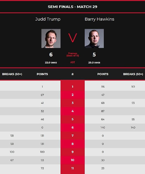 第五局,特鲁姆普率先打进红球拿到46分后击打蓝球失误并给霍金斯留下上手机会,霍金斯打进红球成功上手,再拿到55分后击打咖啡球出现失误,但是没有给到对手好机会。随后特鲁姆普防守出现失误,霍金斯打进咖啡球和蓝球确定以64:46完成超分从而以4-1领先特鲁姆普获得三局的领先优势。第六局,特鲁姆普尝试远台进攻出现了非常严重的失误。随后霍金斯打进红球成功上手并直接轰出单杆140分的赛事最高分以140:0拿下此局比赛的胜利从而以5-1的巨大优势领先特鲁姆普率先拿到了赛点。
