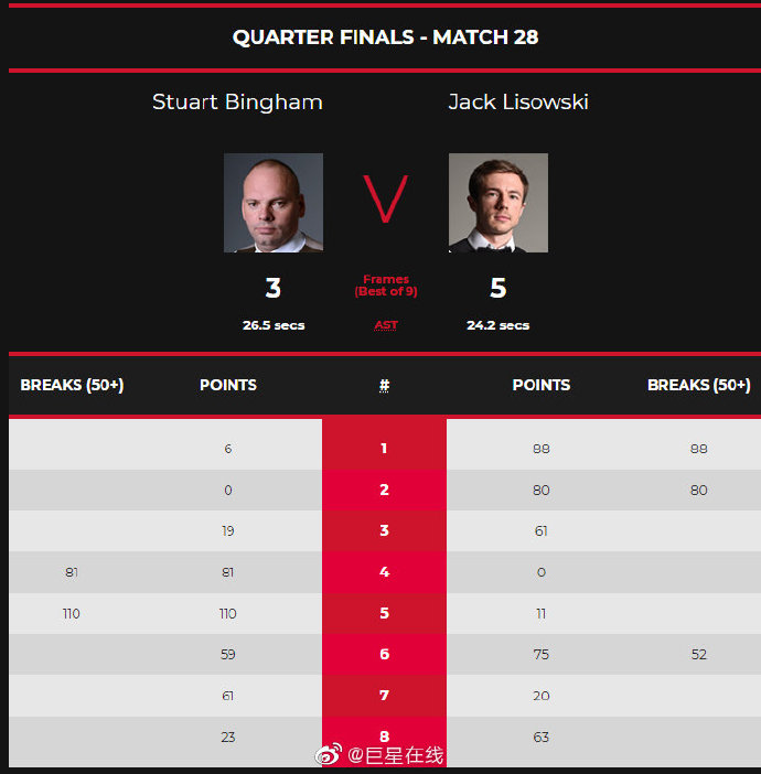前两局,利索夫斯基强势,连续打出单杆88分和单杆80分,连赢两局。第三局,宾汉姆依旧不在状态,利索夫斯基多赶上手,零敲碎打61-19再下一城,3-0领先。第四局,宾汉姆单杆81分,一杆制胜零封了利索夫斯基,利索夫斯基3-1进入到中场休息。