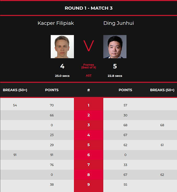 第一局,丁俊晖多杆上手打到了57分,不过菲利皮亚克再次上手后打出了单杆54分,并且完成了清台,70-57先下一城。第二局,丁俊晖又出现简单失误,菲利皮亚克多杆上手完成超分,丁俊晖被超3杆斯诺克虽然没有放弃,但菲利皮亚克还是66-30轻松拿下,丁俊晖大分0-2落后。