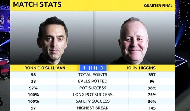 第七局,奥沙利文开球失误,希金斯打进中袋红球上手单杆直接轰出134分以134:0拿下此局取得4-3的领先。第八局,两人的连续破百终于断掉,错失追平单场六杆破百纪录,希金斯先得20分后,一杆得到88分,以108-0零封5-3拿到赛点。