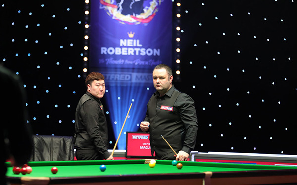 首局比赛中,颜丙涛安全球失误漏球,马奎尔反切底袋红球失误停袋口,颜丙涛上手围球连得40分后中断。此后颜丙涛又打进一杆长台,52-0在顶袋进攻出现失误,颜丙涛围球追分拿下36分后转入防守,此后颜丙涛第二次上手清台拿下这局1-0领先。第2局比赛中,马奎尔打进一杆长台后准确叫位黑球,连续打进5红5黑后母球贴住红球进攻中断。颜丙涛随后两度上手拿下去16分后打丢底袋架杆,马奎尔第二次上手55-16领先后底袋红球再次失误。这轮安全球争夺中马奎尔长台没能打进,颜丙涛再度上手清台完成逆转,总分2-0领先。