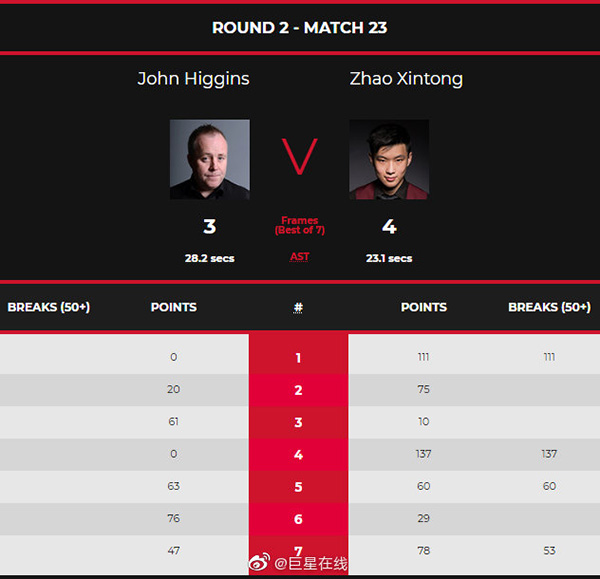 第一局,防守比拼,希金斯安全球打薄了,留下机会,赵心童上手逐渐化解局面单杆111分拿下第一局。第二局,希金斯7分,赵心童摔袋,两人开始了漫长的防守比拼,希金斯摔袋留下机会;赵心童手摆位上手单杆单杆37分,拼蓝球不进;希金斯1分黑球不进;赵心童单杆21分以62-13超分;希金斯追回7分防守,赵心童打进红球单杆13分以75-20拿下。赵心童2-0。