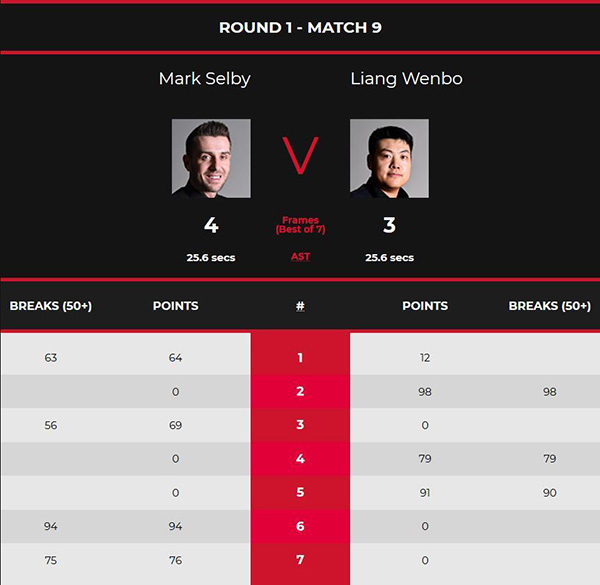 第三局塞尔比的长台同样精准,不过他只得到13分就转入防守,随后梁文博再次漏球,塞尔比上手打出单杆56分69-0超分,梁文博选择认输没有尝试去做斯诺克争取。第四局梁文博通过右侧中袋红球上手,走位不到就通过准度调整,打出单杆79分扳平比分。