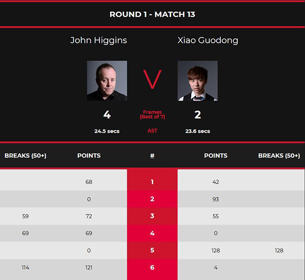第一轮,世界排名第26位的肖国栋,就遇到了4届世锦赛冠军希金斯这位强大对手。过往,肖国栋与希金斯有过4次交锋记录,战绩为4战2胜2平,肖国栋并不怵希金斯。