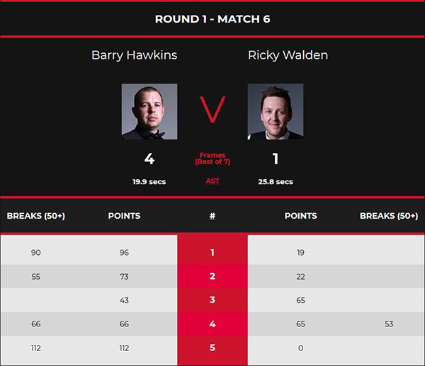 第一轮率先结束的一场比赛,世界排名第12位的霍金斯,以4-1战胜了世界排名第21位的名将沃顿。此前,霍金斯与沃顿两人有过21次交锋记录,霍金斯10胜11负处于劣势。本场比赛,霍金斯从一开局就展现出非常好的竞技状态。