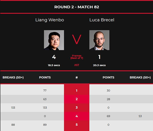 第5局,开局后布雷切尔连攻带防漏袋口,梁文博长台打进袋口红球后白球位置不理想,打黄球失误。布雷切尔打薄球中袋也失误,梁文博打进翻袋红球上手,单杆得到88分拿下比赛。最终梁文博4-1击败对手晋级32强。