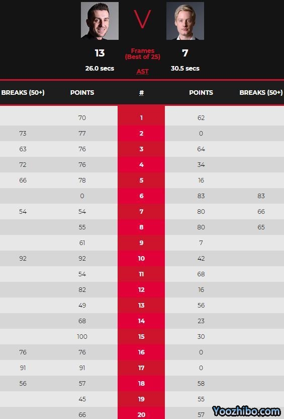 第17局,塞尔比手感状态依然俱佳,上来便单杆91分12-5直取赛点,不过罗伯逊没有放弃,第18局罗伯逊零敲碎打让塞尔比的一杆56分化为虚有,58-57扳回一局,第19局再以55-45将比分改写为12-7,不过塞尔比不敢再给罗伯逊任何机会,抱有任何幻想,以总比分13-7终结比赛。