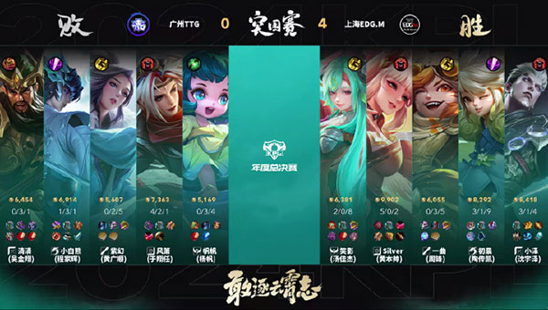 最终团战:决胜团时兵线已经进到TTG水晶,正面EDG.M也打赢了团战,一波团战团灭TTG,拿下比赛的胜利9。本局MVP为上海EDGM笑影(汤佳杰)的少司缘7。