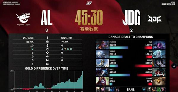 决胜局,赛前Solo,Shanks使用飞机战胜Ale的飞机。前期Shanks加里奥走脸被Scout慧单杀,先锋团Flandre闪现贴脸先杀闪现撞墙的Pyez,王杰金克丝带走Xun启动再杀Ale拿到双杀,AL打出0换3,经济领先3k。中期Tarzan河道被Scout控住后,JDG集全队之力击杀Tarzan,但紧接着Tarzan还以颜色在河道拍住Scout将其融化,AL打出1换3吃掉大龙,经济领先2k。后续Tarzan河道再拍Scout,后者没闪直接再次阵亡,小龙刷新Xun帮助JDG抢掉水龙魂,AL此时经济依然领先6k。后期Peyz中路迷路直接白给,AL吃掉大龙,JDG则四人收掉老龙。第二条大小龙刷新后,Tarzan野区再拍Ale,AL再吃大龙后去开老龙,河道Flandre开到Scout后,JDG直接放掉远古龙,最终AL大龙+远古龙加持冲上JDG高地,JDG双C瞬间蒸发,AL轻松推平JDG基地,以3-2的比分拿到比赛胜利晋级决赛,JDG则掉入败者组面对BLG与TES的胜者。本局MVP为Flandre阿萝拉!