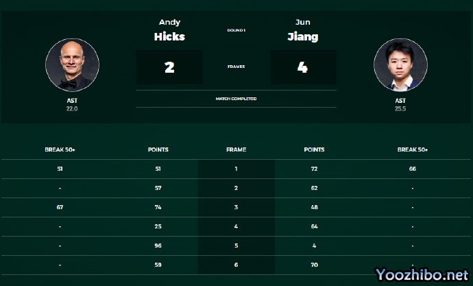 在江俊和希克斯的比赛中,两位球员都打出了非常不错的竞技状态。在首局比赛中,江俊凭借单杆打出66分的表现以72-51的表现上演单局逆转取得1-0的领先。