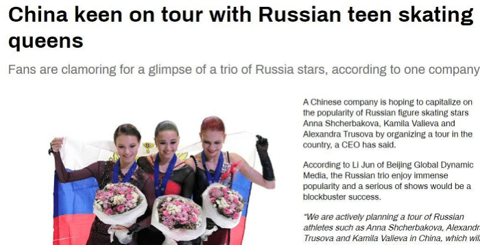 就在近日,有消息称“三套娃”有可能来到中国进行巡演,这是根据俄媒RT报道称,千金、K宝和莎莎引发高度关注,目前一家中国公司正在积极运作中。因为被集体禁赛的原因,所以“三套娃”在冬奥会之后无缘参加世锦赛,之后的竞技类比赛都无法参加,但也不妨碍她们参加冰演,此前他们就在俄罗斯和多个国家进行冰演。