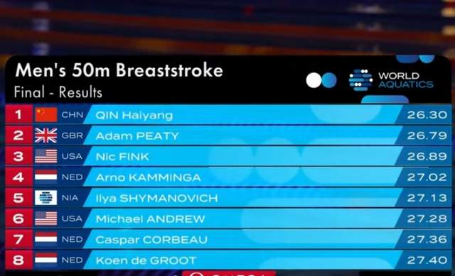 可以说,覃海洋依然将状态维持在高位,连续3个星期都参与3项角逐,但他依然不知疲惫。值得一提的是,皮蒂此役以26秒79获得亚军。这位29岁的昔日蛙泳霸主,状态正在稳步提升。该项目的世界纪录也是皮蒂保持的25秒95,皮蒂保持着该项目历史前6好成绩,之后就是覃海洋的26秒20。